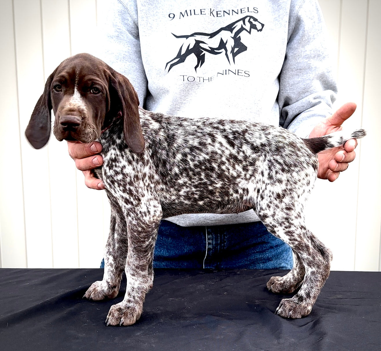 At 9 Mile Kennels our goal is to produce the highest of quality gun dogs in the field, and the most lovable, cooperative family dogs. Trainability and livability is key, and what we strive to produce. We believe that our dogs are our family. We have been extremely careful in selecting lines, lines from America and Germany, and traits to put together to produce the best puppies. Going back to how the traditional German Shorthair was intended to be, a great family dog that is able to work right along side with you, hunting or doing day to day tasks.